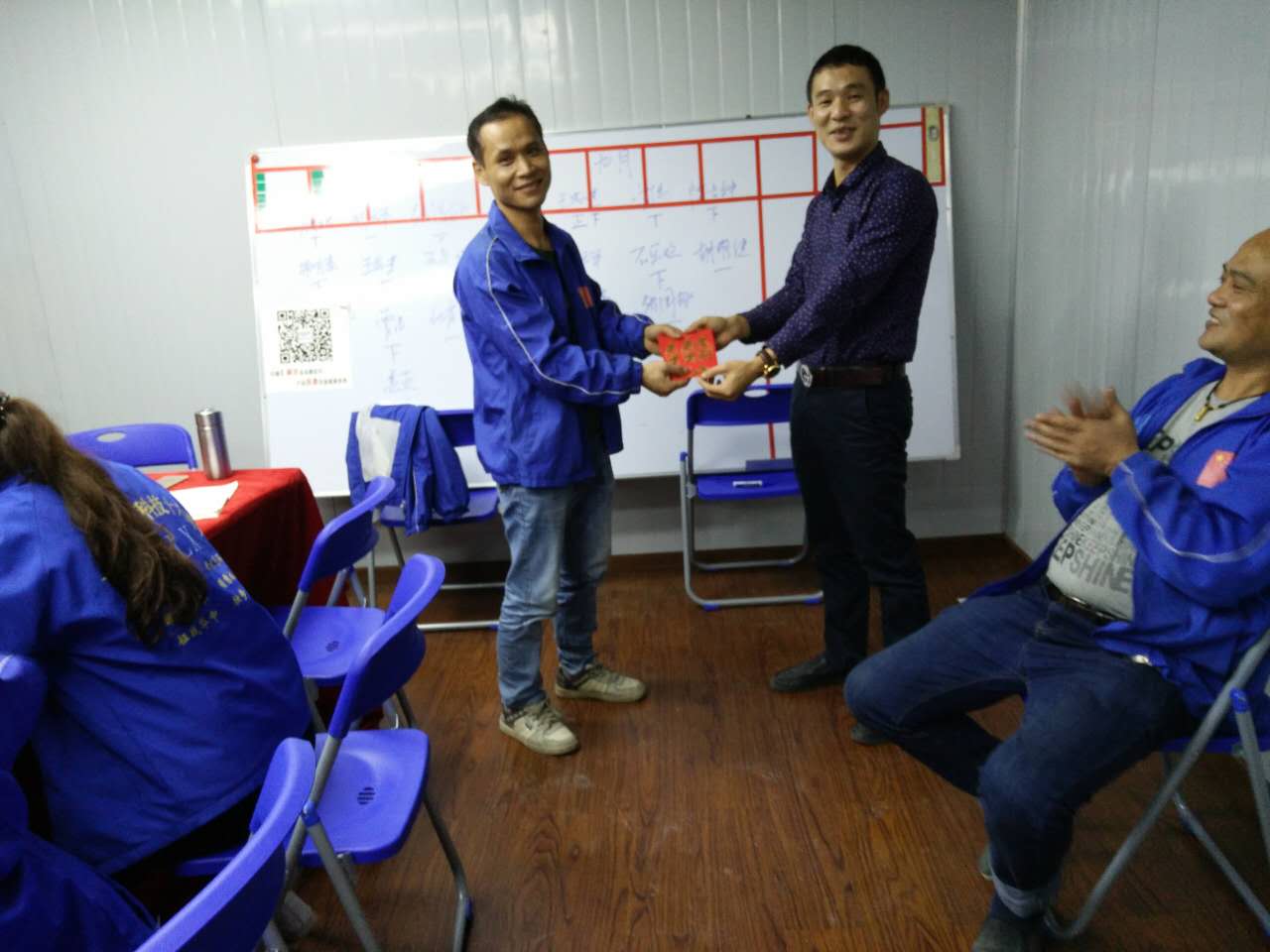 胡總經理(右圖)為每月度最佳奉獻獎榮獲者王成建(左圖)頒發(fā)獎金,同時祝賀匯利興家人王成建榮獲雙星(八月、九月)進而也感謝無私奉獻的匯利興家人,感謝他們的辛勤付出,有著每一位匯利興家人的無私奉獻,相信匯利興定會越走越遠。