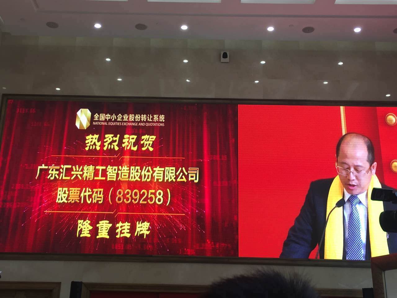 從2015年,匯興智造啟動(dòng)進(jìn)軍資本市場(chǎng)的戰(zhàn)略,在東莞證券股份有限公司、大信會(huì)計(jì)師事務(wù)所(特殊普通合伙)、廣東莞泰律師事務(wù)所等合作伙伴、各級(jí)政府、社會(huì)各界的幫助下,開始“新三板”掛牌籌備工作,并于2016年5月完成了股份制改造直至今日(2016年11月1日上午10點(diǎn))在全國中小企業(yè)股份轉(zhuǎn)讓系統(tǒng)儀式大廳成功掛牌上市。