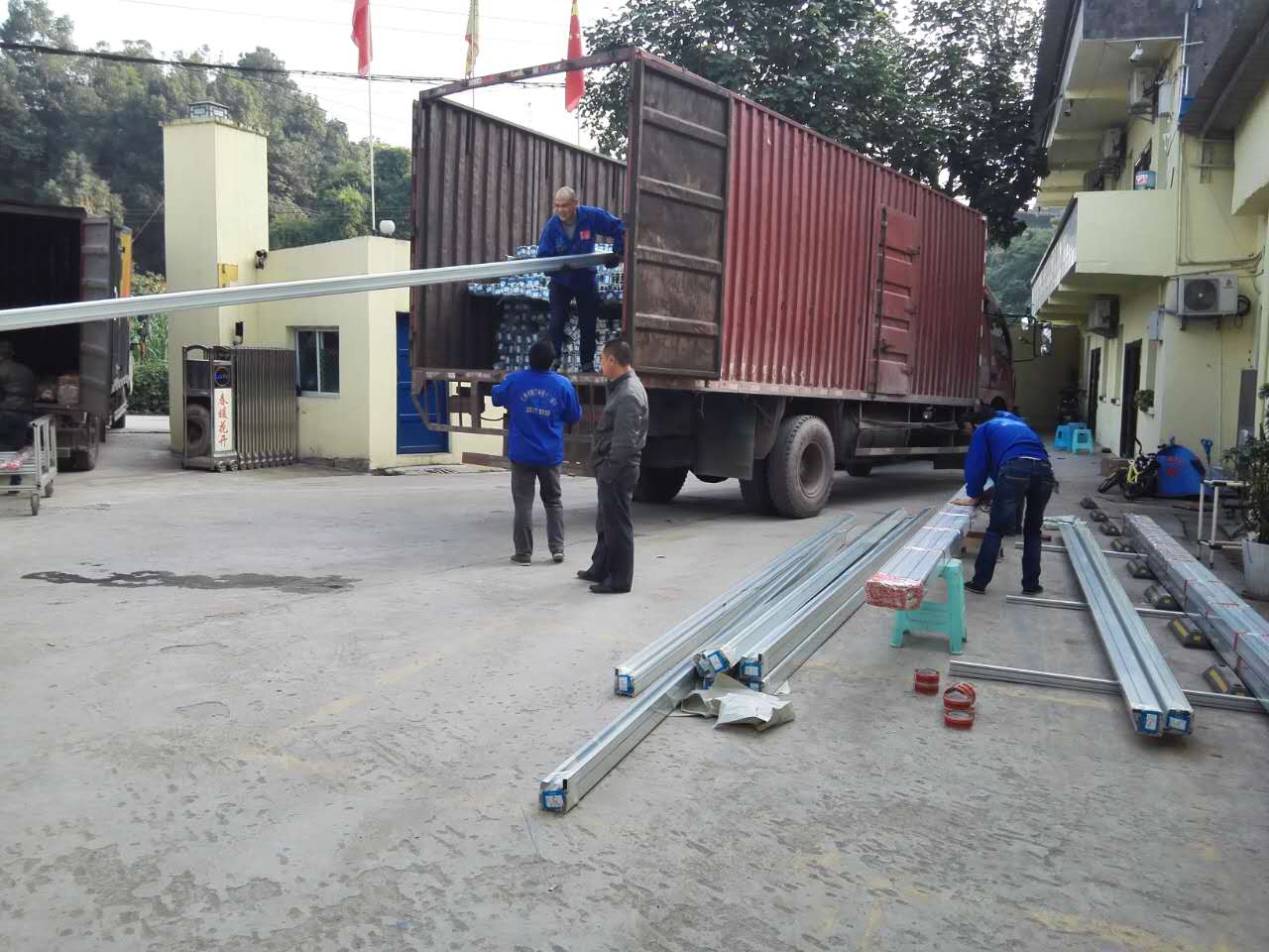匯利興人呈接龍式搬運鋁型材同時鋁材打包出貨一并進行
