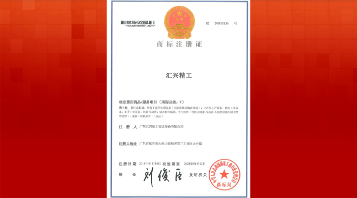 陽春三月,萬物復(fù)蘇。廣東匯興精工智造股份有限公司的喜訊就如鮮花綻放、嫩芽出頭,一個接一個,讓人應(yīng)接不暇。3月13日,一份商標(biāo)注冊證書飄然而至。這為“匯興精工”的商標(biāo)注冊證書已經(jīng)是中華人民共和國國家工商行政管理總局商標(biāo)局為匯興智造簽發(fā)的第9份商標(biāo)注冊證書。