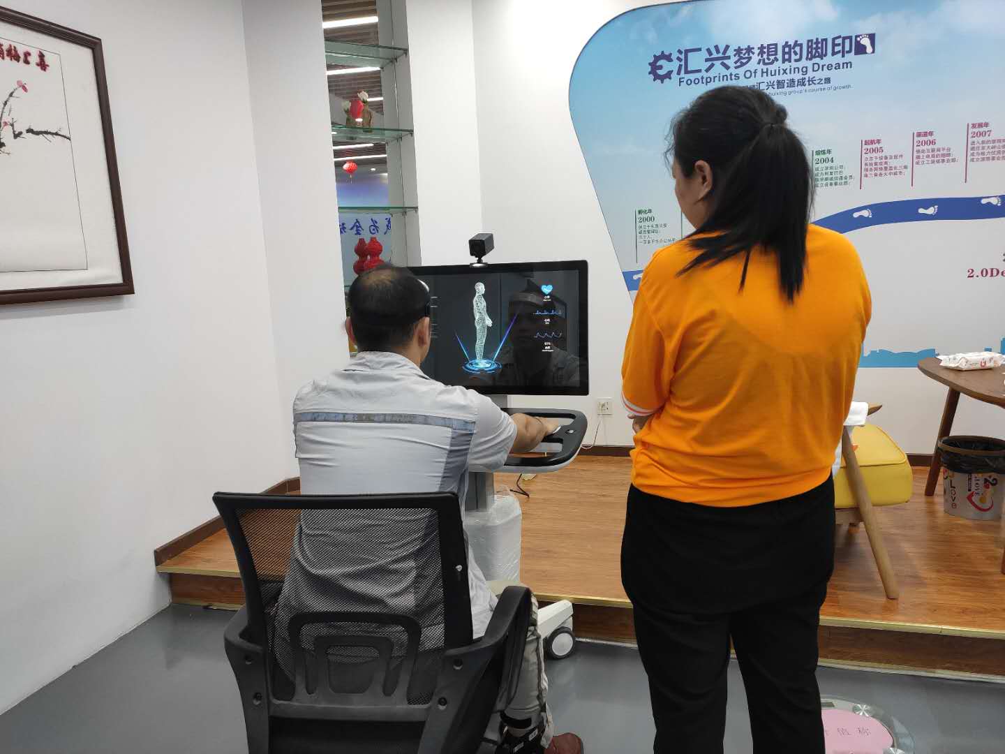 智能體檢+機(jī)器人在“不抽血、不化驗(yàn)”的情況下,只需將“雙手覆蓋手掌傳感器上的電極片,面部正對(duì)攝像頭”,用兩分鐘的時(shí)間就能檢測(cè)出70多種身體健康;既方便又快捷,并有效節(jié)約了大家的時(shí)間,充分達(dá)到了“早診斷、早預(yù)防、早治療”的目的,讓員工們以健康的身體投入到各項(xiàng)工作之中。