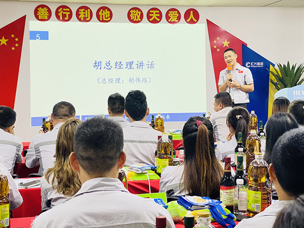會(huì)議第五項(xiàng),胡偉路總經(jīng)理講話。首先胡總經(jīng)理感嘆時(shí)光飛逝,歲月如梭,驀然回首,已到初秋之際,2021年僅剩下僅有的100多天,在這攻堅(jiān)的三月里,全體員工仍需拿出“紅軍不怕遠(yuǎn)征難 萬(wàn)水千山只等閑”的民族氣概,朝著我們的目標(biāo)拿出我們的士氣卯足勁兒的向前沖;其二、胡總經(jīng)理向全體員工展示公司中秋禮品并解析禮品寓意(柴、米、油、鹽、醬、醋、茶),以生活中不可缺之的物品讓全體員工深刻感受到公司的關(guān)懷和關(guān)愛(ài),并從側(cè)面宣導(dǎo)全體員工在工作崗位中,對(duì)待同事要有溫度,對(duì)待工作要有態(tài)度;花若盛開(kāi),蝴蝶自來(lái),你若精彩,上天自會(huì)安排;其三、通過(guò)一則短視頻向全體員工宣導(dǎo)反哺之恩 、舐?tīng)僦?,進(jìn)一步勉勵(lì)全體員工要有一顆感恩的心,感恩身邊的人;其四、創(chuàng)立夢(mèng)想基金,鼓勵(lì)員工加大產(chǎn)值賦能,為公司為個(gè)人謀福利;同時(shí)也進(jìn)一步勉勵(lì)全體員工,“寶劍鋒從磨礪出,梅花香自苦寒來(lái)”,只要我們一起努力,相信我們一定會(huì)實(shí)現(xiàn)我們的目標(biāo),讓我們一起擼起袖子加油干!
