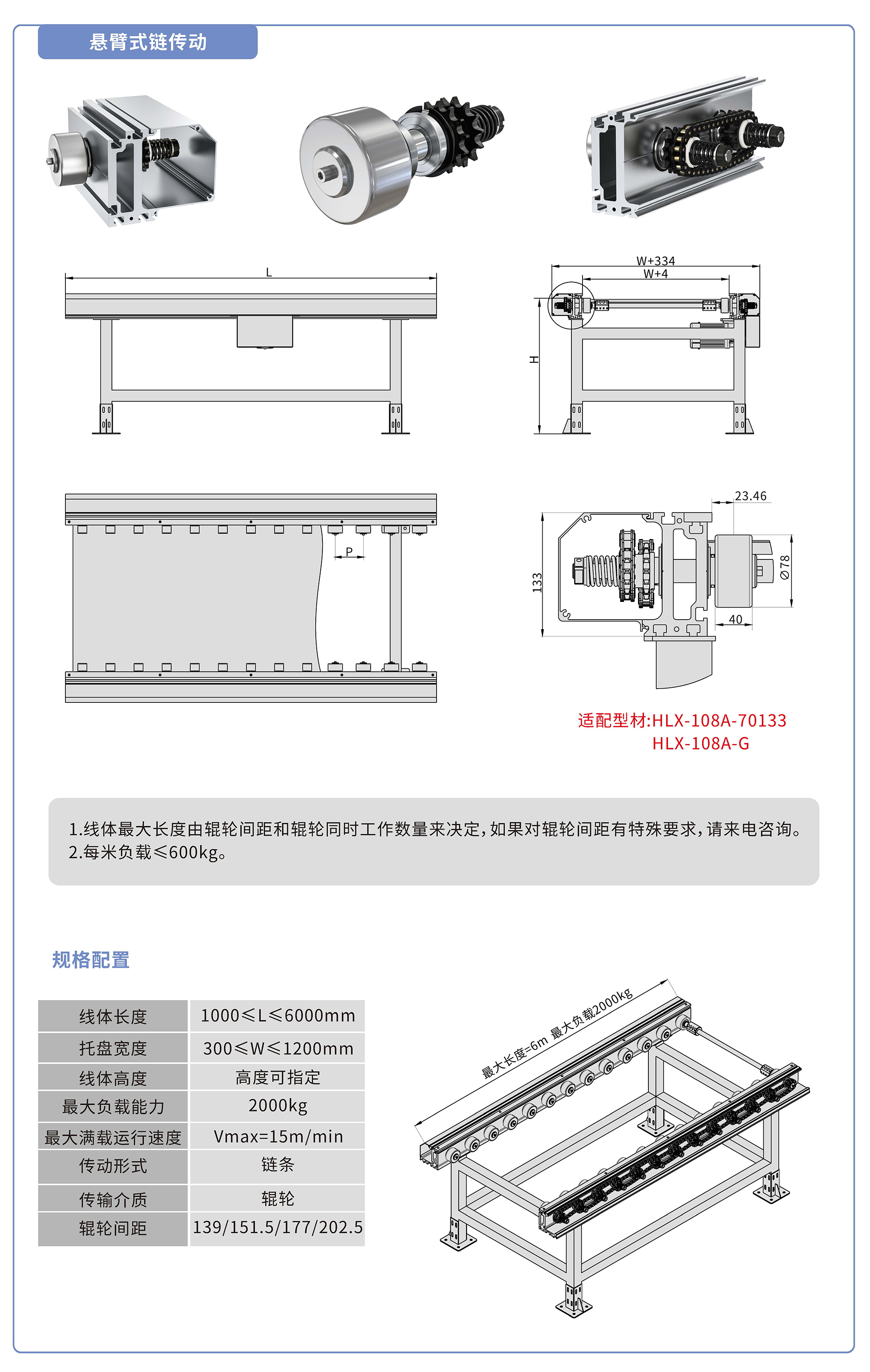 采用70133鋁型材,鏈輪傳動,鍍鉻滾輪鑲嵌銅套實(shí)現(xiàn)積放功能,負(fù)載2000kg/米,最大負(fù)載速度15M/min, 輪距139、151.5、177、202.5可選,適用托盤寬度300-1200mm,線體長度范圍1000-6000mm, 高度根據(jù)需求定制.